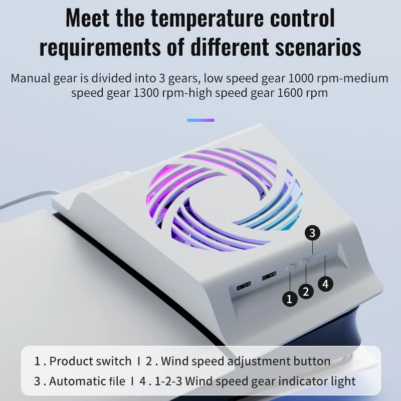Aolion RGB Temperature Sensing Side-mounted Cooling Fan For PS5 Slim Digital/Disc Version 2 USB Ports Host Side Cool For PS5 PRO